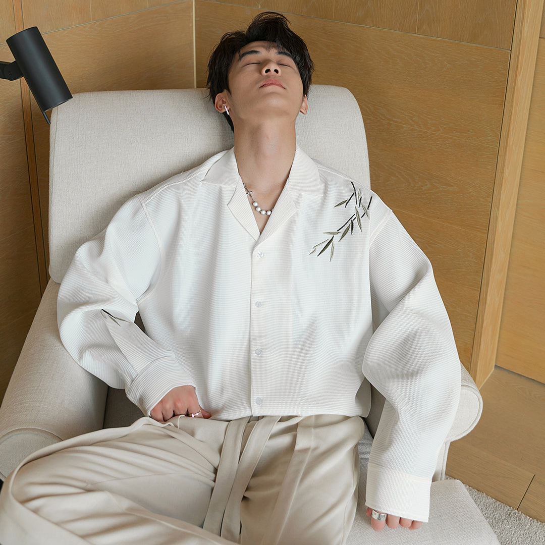 Mens Loose Casual Bamboo Embroidered Long Sleeve Shirt
